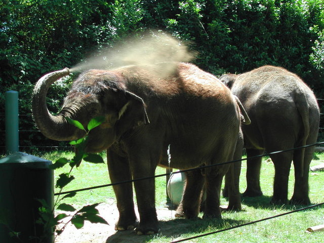 大象噴沙。有兩隻大象一隻小象,小象在玩草地上的球,有看到嘛?
