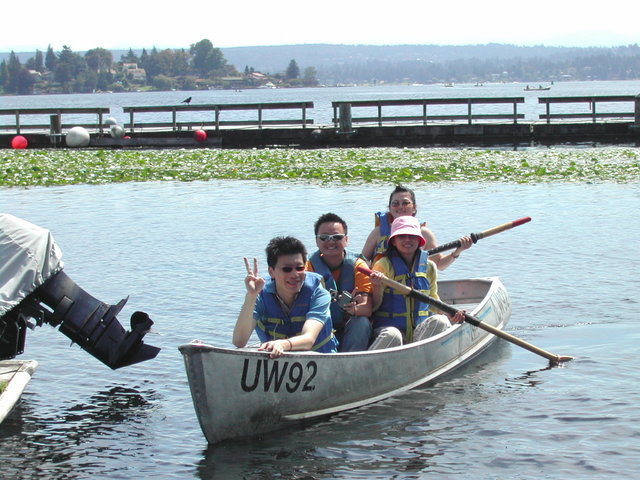 早上先到華盛頓大學划船,因為人數眾多且小船比canoe(獨木舟)便宜多了,我們便選擇一船4元、至多可坐4人的小船。一早太陽就非常大,再經由水面反射陽光,大家的眼睛幾乎都睜不開來,再加上船其實頗重的,而且我們又不熟練划船的技術,在一個小時的划船時間裡,就已搞得大家暈頭轉向、手腳發軟。回到家裡匆匆的吃過午飯,便趕緊前往下一個行程。