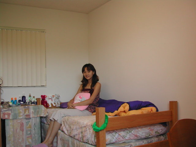 宿舍樓高四層,我住在三樓,與一個室友共同share浴室和廚房,窗戶望出去是一片草地,上頭栽了幾棵椰子樹,遠方是一片樹林,映著藍天白雲,還蠻令人心曠神怡的,對這個房間算是滿意嚕!