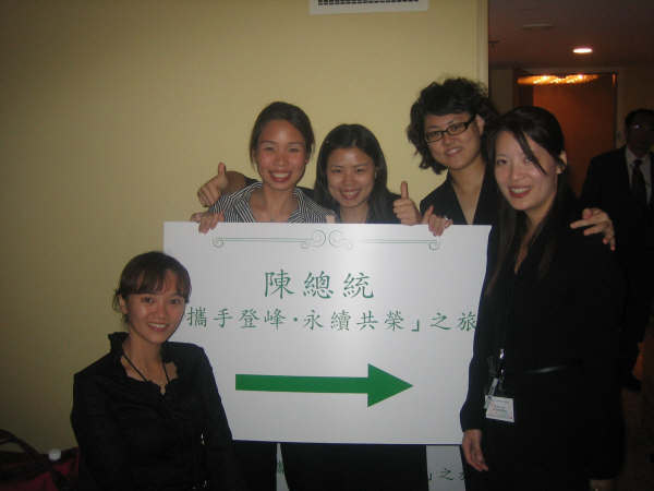 不過因為晚進宴會廳,阿扁的致詞早已完畢,我們只能在後方偷偷的瞄著他和蘇貞昌還有一些大官的臉。聽說很多在宴會廳接待的學長姐都已經跟阿扁和衝衝衝握過手了,害的我們這幾個負責簽到的人,期盼著可以有天上掉下來的機會可以跟他們近距離接觸。皇天不負苦心人~當阿扁要離開時,我和學姐們衝到門口去堵他,在經過一番掙扎之後,終於如願的和阿扁握到手了。我的天呀!好舒服~~今天也算是值回票價了~