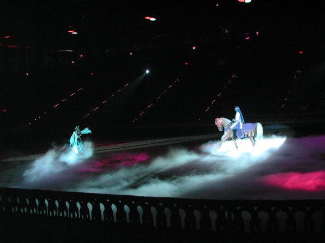Arabian Nights裡的表演。公主與國王站在高台上,看著底下的人表演各種馬術。