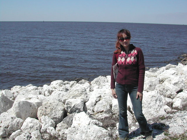 在接近Okeechobee的路上,有一段路一直沿著一條河流前進,風景優美自是不在話下,志揚說他有朋友在這邊採集鱷魚頭骨化石唷,真是一種米養百種人!到達Okeechobee湖邊,當我們慢慢駛上堤防頂端,一望無際的Okeechobee迎面而來,大家都忍不住驚呼一聲!在陸地上有一個像海一般寬闊的水域,真是很令人驚奇。在靠近湖邊的地方,有一個男生和"某個東西" 在看風景,Cony說:「哇!他還帶狗來玩呀!真有心!」我:「那是小女孩啦!」志揚:「那是他女兒啦!」答案揭曉,是他女朋友啦!哈哈!現在這個年代,還會有誰留長長的頭髮分兩邊綁,又剛好趴在草地上找東西,頭髮在耳朵兩邊垂下來,像不像一種狗?哈哈哈哈!當日最好笑笑話~