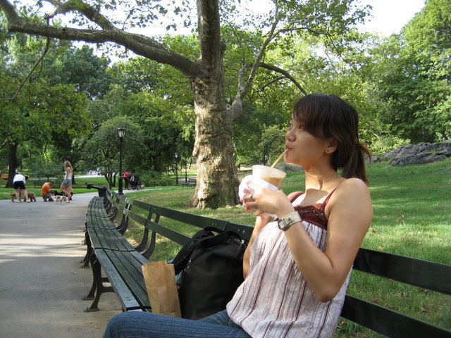 從hostile走到這裡,不是很遠,雖然背著行李,但朝著公園綠意走去讓人身心愉快。在路上的早餐小吧買了可頌和冰咖啡,兩人坐在公園的長椅上,悠閒的享用著,順便看著往來的人群。誰想的到在八點的上班時間裡,還會有那麼多遛狗、溜孩子、慢跑、拿網球拍的人走來走去呢?背後有個大金主是吧?!