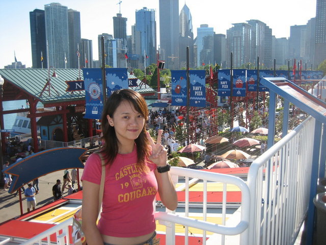 結果~我們今天下午太陽還很大的時候就過去了。Navy Pier就在密西根湖旁邊,海風吹來涼爽,但是陽光經由湖水反射更是夠勁,我不僅被太陽曬得快暈過去,眼睛也睜不開,腳也因為當初跟學弟自誇"很能走"而被他帶著到處走目前痠的要命,所以剛到那邊時有點累。