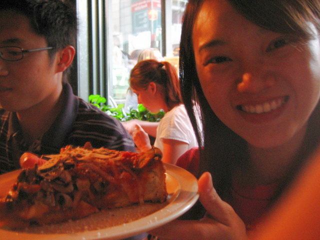 因為全美就Chicago有兩家提供正宗UNO Pizza的店,它可不接受電話預約的呢!我和學弟先去店裡訂位,在確定一個小時之後才輪的到我們,我們就去附近的百貨公司歇歇腿。時間差不多和學弟的朋友們會合後,我們六個人,還稍微的在店外等了一下,才被叫到,生意真的很好。
