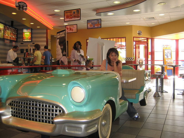 照例睡到自然醒,原本想去體驗另外一家Breakfast buffet的計畫又泡湯了,加上晚上計畫去吃ponderosa的dinner buffet,於是我們挑了burger king吃早午餐。這家burger king裝潢還蠻有特色的耶~走復古路線,紅色的沙發座椅,椅背上都是古老影星的黑白照片,還有一台車車造型的座位,有夠可愛。Burger king是我在美國覺得算好吃的速食了,不過一連著三天都吃速食,回去不敢量體重了!