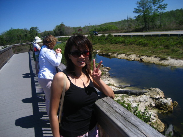 半路先在H.P. Williams Roadside Park休息,順便看看鱷魚。這個點也是上次和老姊姊一起發現的。一個在公路邊的小小休息站,在Canal上闢了一條步道,可以往下觀看水道。水道裡有約莫10來隻鱷魚,每隻都很大隻,有的趴在岩石上曬太陽,有的在水裡漂浮。在這邊看到的鱷魚,會比坐Air Boat去沼澤區看到的還多唷!而且我好喜歡鱷魚,這一次在沿途的Tamiami Canal裡,常常驚鴻一撇到在水裡躲在草叢裡的鱷魚。這次挑這條路走真是太對了的選擇。