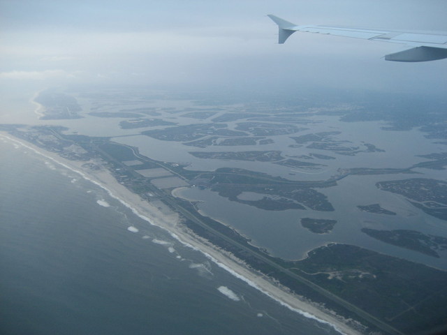 飛到紐約只要三小時,所以坐上飛機沒多久,電視台隨意轉轉轉,喝個飲料,吃個餅乾,睡個小覺,竟然就快要著陸了。比想像中還快。這時候是晚上八點,天還未全黑,可以看到一些地面景物與燈光點點。在接近JFK機場前,有一區是高級住宅區耶,從上空可以看到一棟一棟獨棟的別墅,有自己的網球場、游泳池,周圍被一片樹林圍起來,真是令人開了眼界。