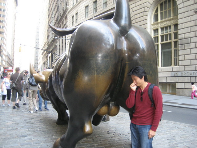 這個金牛是很多電影喜歡拍攝的場景之一。我記得小時候看過馬丁勞倫司演的一部電影,他被人追(殺?),後來躲到金牛屁股後面,一邊偷偷觀察追他的人一邊罵:「shit!」哈哈~他躲在牛屁股後面不就是一坨屎嗎?我小時候看到這一段差點沒笑屎,也一直覺得這牛很可愛。