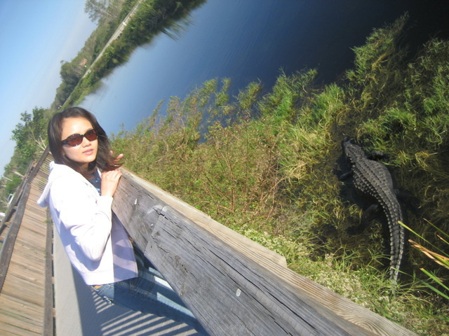 到了Oasis Visitor Center停好車之後,看鱷魚的布道上有一些遊客往水禮張望,我們也懷著忐忑的心情過去一探究竟。耶!!有鱷魚了耶!!雖然數量不多,但是有一隻超肥鱷魚躺在岸邊,還有一些小鱷魚或是在水裡划行或是躺在岸邊曬太陽。我們也在這邊看了好久的鱷魚。呵~~不知道為什麼,看到他們懶散的躺著曬太陽,短短的腳會捲曲成好笑的姿勢,看起來就是非常懶惰討打,哈哈!!
