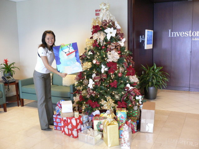 華麗的大大聖誕樹~我手上的是我提供的禮物唷~裡面是三層包裝成雪人的餅乾禮盒~
