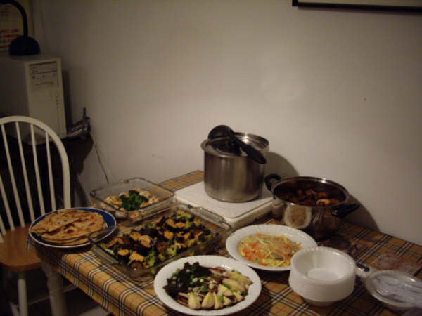 晚上到的時候,桌上已經擺了嫣嫣帶來的兩道餐廳級素食料理,一個是香菇鑲豆腐,一個是豆皮海帶捲,還有一大鍋料好實在的羹湯,真是料理高手呀!!還好我們帶來的魯味有美國難得一見的魯海帶與豆乾,加上精美的刀工與裝盤方式,也是很搶手,至於那個涼拌三絲,真的是吃之前要三思,總覺得味道怪怪的,還好配色還不錯。另外志揚的魯鍋裡滿滿的從台灣寄來的豆輪,我大概吃了五個吧!這個好東西真是美味~~