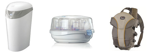 這三個東西由左至右依序是:尿布垃圾桶、蒸奶瓶器、嬰兒前背袋~