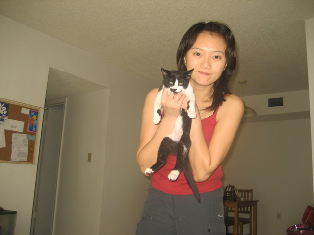 一進門,一隻比我預期中還要大一點的小貓咪在地板上活蹦亂跳著,天啊~~~和社區裡常見的小貓咪們一樣,都只是黑白兩色,不過他主人卻給他取了個色彩繽紛的名字—Rainbow。小貓咪雖可愛,但是解決生理需求還是比較重要啊~~趕快把炸雞拿出來吃,還吃了賽林娜煮的水餃,飯後還有西瓜和荔枝。是的,荔枝這種在美國有錢人才吃得起的玩意兒,拜賽林娜在蔬果公司上班之賜,要荔枝有荔枝,要龍眼有龍眼,之前去他老闆的豪宅party時,還可以盡情的吃一大箱的紅毛丹。