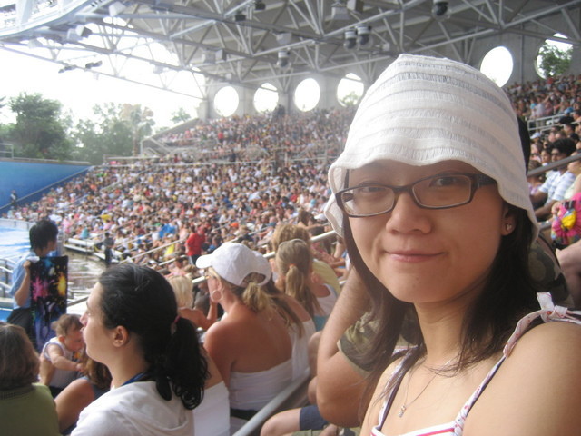 這個週末氣象預報說是會下雨,不過今天白天還是艷陽高照哩~~有了上次快被曬死的經驗之後,我們這次帶了帽子出門,擋掉了些許陽光,人也覺得精神多了~~因為今天來得早,所以我們決定先去Shamu那邊排隊,希望可以坐到離他很近的位置。離表演時刻還有45分鐘,場地還未開放入場,但是門外已經等了一堆遊客,殺人鯨的表演真的很受歡迎啊!!開始進場之後,很幸運的我們坐到了Shamu會上去的平台,這裡也是soak zone,就是會被水噴濕的地方,沒辦法啦~~想近距離看殺人京就要付出被水噴濕的代價哩!!不過天氣這麼熱,大家可是超享受這種全身濕答答冰涼涼的感覺呢!!距離開始表演還有30分鐘,全場座位已坐滿4/5,剩下的都是好高好遠的位置,真的是要看表演要趁早哩~~