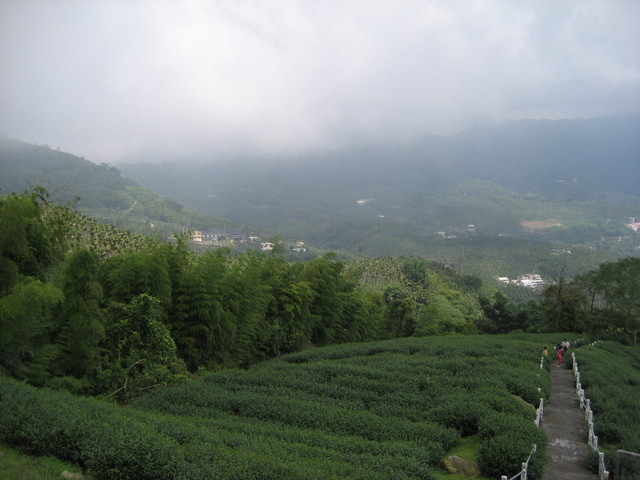 山裡的茶園以及遠方山上的雲霧~茶園小道上有遊客散步唷~