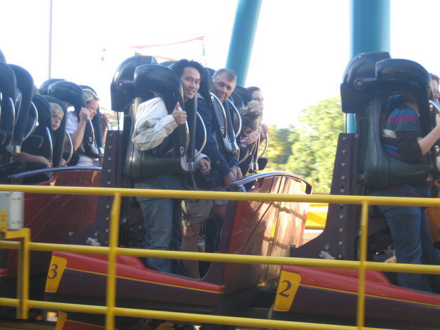 本來還不曉得為何這個ride(The Georgia Scorcher)會吸引那麼多人來排隊,後來才發現,這是一個”站著玩的雲霄飛車”。當你站定之後,屁股下面的一個可以隨身高調整的座椅會固定,所以人即使站著,累了的話或是腿軟還可以有個支撐。站著的雲霄飛車確實是很特別的體驗,站著轉、站著往前衝,還蠻好玩的,今天稍後我又玩了一次,鍵哥則是玩了兩次呢!