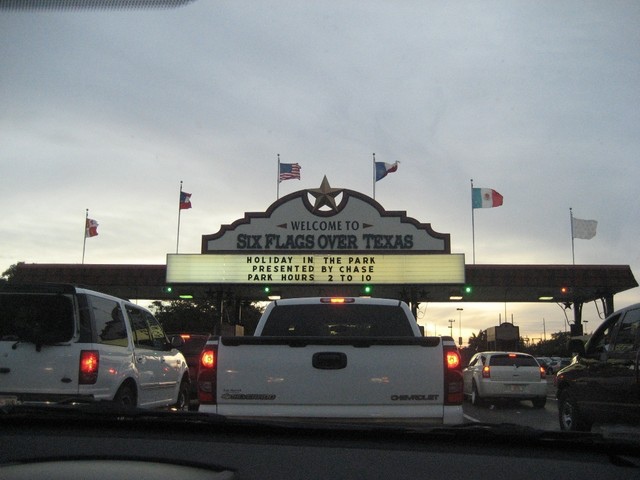 六旗的入口,真的插了六根旗子。之前去參觀Tower of Americas, San Antonio時,提到在德州歷史上著名的六面旗子,不知道和六旗遊樂園有何關係?~