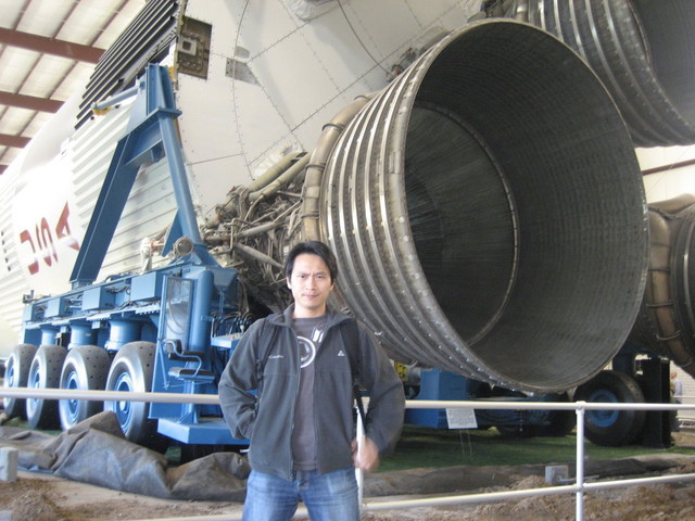 整個Tram行程最有看頭的就是參觀真實的火箭了。在整個行程的最尾聲是進入一間超大的倉庫狀的鐵皮屋裡,裡面擺了一架太空梭呢!(我不曉得這是真的可以飛上天的太空梭還是仿的,因為上一個行程的解說員說一架太空梭至少可以出任務100次呢!如果躺在這邊展示不是會很沒經濟效益嗎?)幾乎所有的參觀者都對太空梭最末端的五個超大推進器最感興趣,大家擠得水洩不通的和他拍照,我們繞著機身走一圈,最頂端是一根很長的針狀物插在太空梭的鼻頭,不知道要幹嘛?有一面牆展示著歷年來的太空任務,包含讓人唏噓的阿波羅13號。為何美國要致力推動探空探險呢?解說員很明確的說道尋找新能源是主要任務之一~是啊~美國真有先見之明,能掌握未來石油的替代能源,就能繼續穩坐世界的老大寶座啊!真是強者愈強,富者愈富啊!
