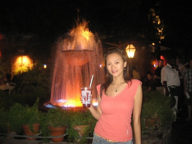 Pat O’briens入口處是一個窄窄的中走廊,走廊底分別有兩個房間,一邊是播放運動節目的lounge,一邊是Piano Bar。走廊盡頭出現一個露天中庭,擺滿了的桌椅幾乎座無虛席,中庭裡有個噴水池,除了燈光照耀外,最頂端竟然還有一盆火燒著,這種水火同源(我是嘉義人啊~水火同源是嘉義縣關仔嶺的著名景點喔!)的噴水池真是有看頭,坐在這裡喝酒聊天乘涼,真是一大樂事。
