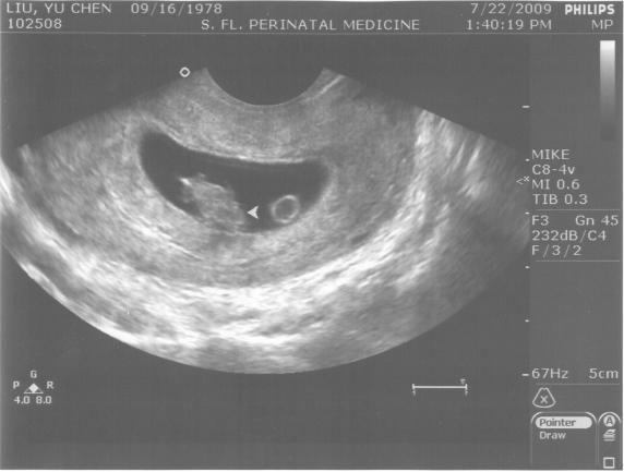 箭頭處的是baby唷~~旁邊有個圓圓的就是寳寳的的營養來源,它會有一條cord連接到寳寳,而它也是會讓媽媽噁心想兔的主要因素(醫生說,如果你有morning sickness, 那就怪這個小圓圓吧~)。