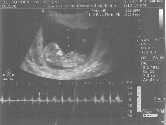 先做超音波檢驗,當我把肚子露出來時,覺得冷氣怎麼好像吹到小肚肚上了,還在擔心著待會抹上超音波液的時候會涼咻咻。不過還好這個液體溫溫的(前兩次照超音波好像也是溫暖的,我本來一直以為是冰涼的,不知道是不昰有加溫過,真是感心啊~),而且想不到當儀器一放在肚子上時,在螢幕上立刻顯現一個小人形狀,天啊~這ㄧ個月的變化也太大了吧?~上個月看還是小點點一顆,現在竟然形態都出現了,頭、手、腳都已經看得到,且因為身體呈半透明,還可以看到小心臟噗通噗通跳著哩!今天也聽了心跳聲,頻率還是很快,而且聲音好奇怪唷~是個我完全無法再模仿的聲音,小貝比真是太神奇的東西了~