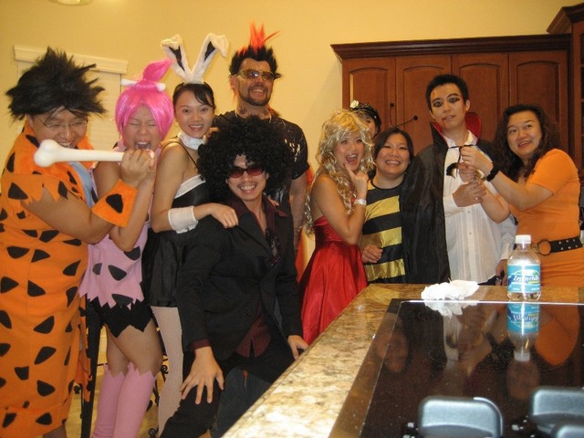 一堆人奇裝異服, 超有趣的啦!! 由左至右依序是: 石頭人家族夫妻, 兔女郎, 爆炸頭, 沖天冠, 瑪麗蓮夢露, 小蜜蜂, 吸血鬼以及女犯人.