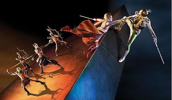 而且整個場景之豪華,道具之先進更是創太陽馬戲團表演秀之最。整個舞台不只是平面的,更可以斜斜的立起來,舞者在上面表演可以顯示出距離的感覺,到最後整個舞台垂直立起,舞者們看起來好像會飛或是蜘蛛人一般,可以(看起來不像有吊鋼絲)在垂直的舞台上爬高、墜落、打鬥。其他像是一艘大船,會上下左右擺動,營造出和大海搏鬥求生的艱辛等等,如果想看高科技佈景技術,來看這個秀準沒錯,也難怪這表演的票價那麼貴,我想全都砸在這些設備上了吧?!