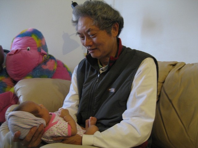 雙手握拳擺在胸前, 躺自我爸腿上的招弟, 好像很認真的聽著阿公說故事哩~~