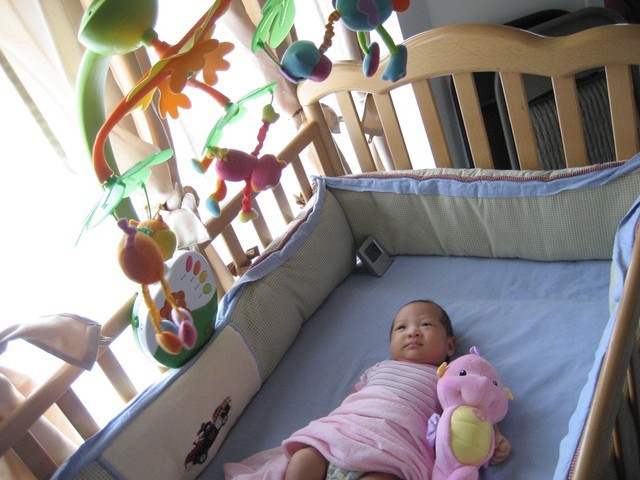 前一陣子去Day Care參觀時,發現嬰兒房裡的小貝比們,幾乎人床一台音樂鈴, Mobil上的娃娃們轉啊轉的,小貝比們目不轉睛的看著,加上會有優雅悅耳的音樂,每個小貝比看起來都很快樂,鍵哥看到我眼中流露出的羨慕之情,說了句:「是不是想買?如果要的話,就早買早享受唄~」鍵哥真是了解我啊!我上網比較了一下款式與價錢後,幾天後就去Babies R Us買到手了。(鍵哥難得豪邁的答應讓我買東西說!)