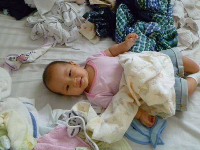 躺在一堆剛烘好的衣服中的招弟~~最喜歡拿毯子起來啃了~~