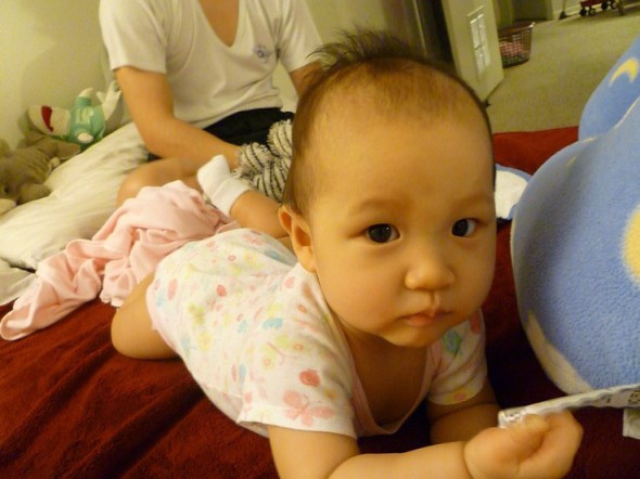 飯後,我們全家三人又一同回到床上陪招弟玩耍。可能因為下午睡飽飽的關係,招弟今晚特有活力,可以為了去抓想要的玩具,穿越過我們用棉被和枕頭築起來的重重障礙,還會把自己撐得好高幾乎要站起來了,看來他的crib床墊要放到最下層了,孩子長的可真快啊!