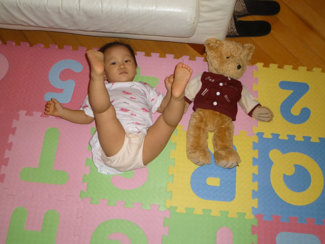 不過招弟這傢伙很能忍尿濕。好多時候尿布都已經濕了,我們覺得尿布變得很重,或是他一屁股坐到我們腿上,發現他整個屁股濕濕的,才趕忙幫他換一片新的布尿布。他都不會主動跟我們說他尿尿哩!其實最一開始招弟尿完了會抓抓屁股跟我們說「噓噓」,只是我們那時不理解他的意思,搞到最後變成招弟很能忍濕哩!都要怪為娘我不知女兒心啦~
