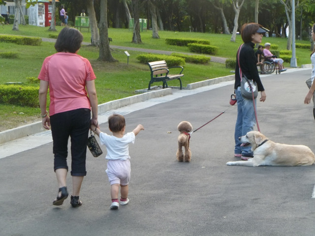 後來我們想帶他到草地上看小狗和放風箏的人時,他又潔癖上身,不肯踩到泥土地上。我只好又撈起招弟,帶著他走接下的路程。大安森林公園其實建設得很不錯哩!我們每次都只逛建國路這個沿線,走不完整圈。加上前幾天去淡水,發現台北的都市建設很讚,實在是市民之福。