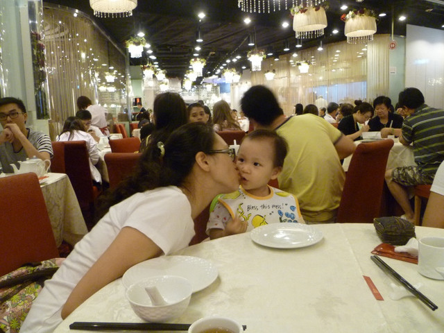 我家這個社區的mall裡,共有三家有點心的餐廳,其中兩家名氣比較旺的餐廳,排隊的人龍超長,因為2點以後的港式點心比中午便宜,所以很多人都挑這個時候來吃。我們快2點抵達餐廳,拿了號碼牌後,大約40分鐘後才有座位。今天特地帶了印印一起去吃,讓他見識見識,而且還可以幫我們照顧招弟,我和鍵哥就可以專心的大快朵頤。