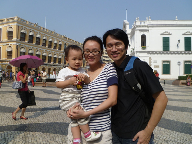 終於在街尾看到大三巴牌樓。想不到前面有一段階梯啊!我牽著招弟慢慢往上爬,鍵哥則推著嬰兒車走旁邊的斜坡。招弟這傢伙竟然只爬了一段後,就要我抱。他現在可是很重的哩!太陽又大,抱得我差點沒暈過去。不過要趕快趁著招弟現在還要我們抱時多抱他,不然以後可就變成男朋友抱了哩!我本來以為大三巴只是一面牆,想不到裡面有個腹地,還可以爬上樓梯到上面看風景。