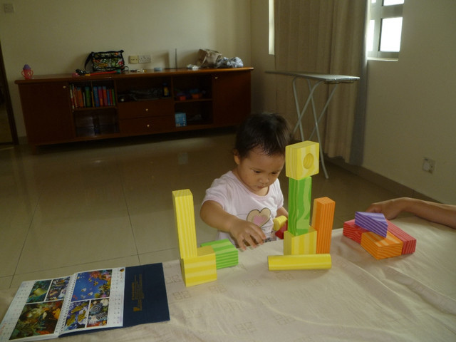 招弟專心的堆著積木~~ 這積木是泡棉材質, 色彩繽紛又不怕撞傷. (2Y1M)
