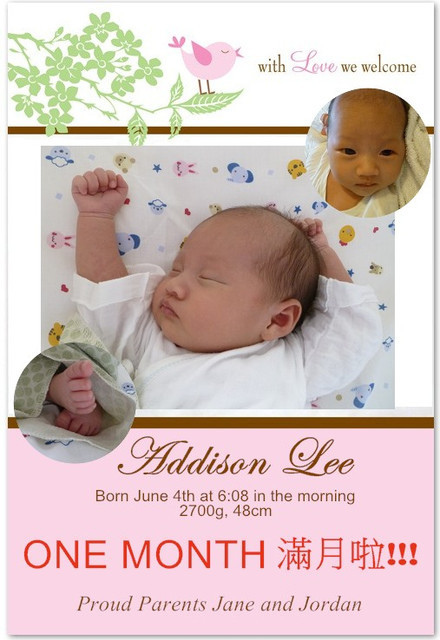 我製作的昭告親友的滿月卡片. 我公公竟然稱之為"滿月賀年卡片", 超好笑的.