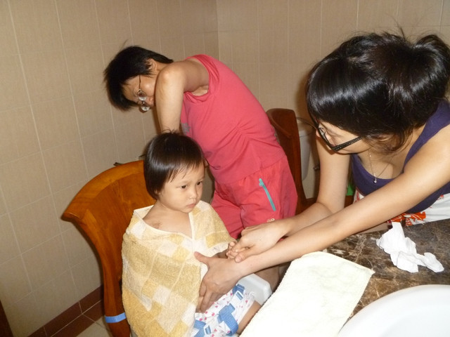 今天早上,我們把招弟騙到浴室裡,結果他機伶伶的看到剪刀就開始哭。我們讓他坐在吃飯的椅子上(避免他亂跑),脫去他的上衣,披上毛巾開始幫他剪頭髮,我跟他說:「握著媽媽的手就不會怕了」,這孩子果然乖乖的抓著我的手,雖然還是淚眼婆娑,倒也順利的修好了頭髮。我本來就很喜歡招弟的髮色,現在髮尾整齊有型,變得更加可愛了!之後我四姨也幫我剪了劉海,我爹更甚至剪短了頭髮,整個人變得年輕了些。想不到我四姨千里迢迢的來到吉隆坡,幫我們一大家子剪頭髮,真是太有趣了!