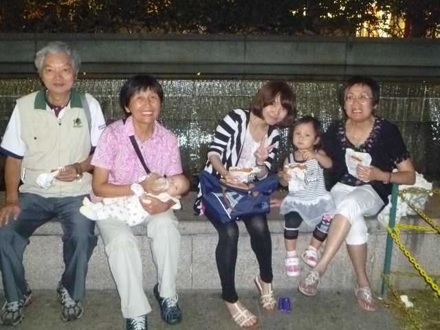飯後我們到公園裡看夜間的噴水表演,晚上9點開始會有聲光水舞秀,雖然沒有很壯觀,但是還頗賞心悅目的。招財這時也醒了,就由我娘餵他喝奶。這孩子真會挑時間,在水舞的陪伴之下喝奶,好像很有氣氛哩!我們大人也沒閒著,鍵哥一人發了一顆Rotuboy咖啡麵包,雖然才剛吃飽,但是Rotiboy很香,我們也大口的吃完了。