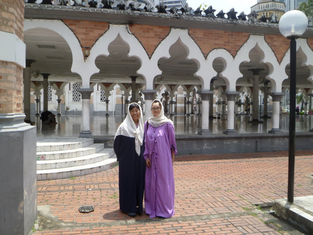 坐LRT到Masjid Jamed站,遵照我婆婆兩個孩子不能進廟的訓悔,把招弟和招財留在車站內給鍵哥照顧,我和我爸媽進入清真寺裡看看。由於已經接近中午12:30休息時間,我們雖被特允進入,但是我媽挑罩袍以及頭套時花了許久時間,工作人員頻頻催促,讓我們在匆忙之中開始參觀行程。還好這清真寺古樸又美麗的建築讓我們覺得不虛此行,也對剛才工作人員的臭臉色釋懷。