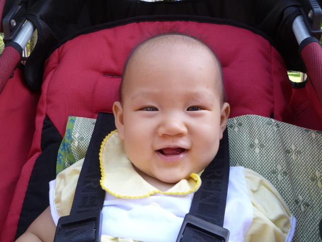 有天我們去吃飯,這孩子站在沙發上扶著後面的椅背玩耍,之後就自己快速的往旁邊移動,移到臨座的阿姨後面,阿姨把招財抱起來覺得他好可愛,招財也笑得很開心。不怕生的小孩就是很討喜。