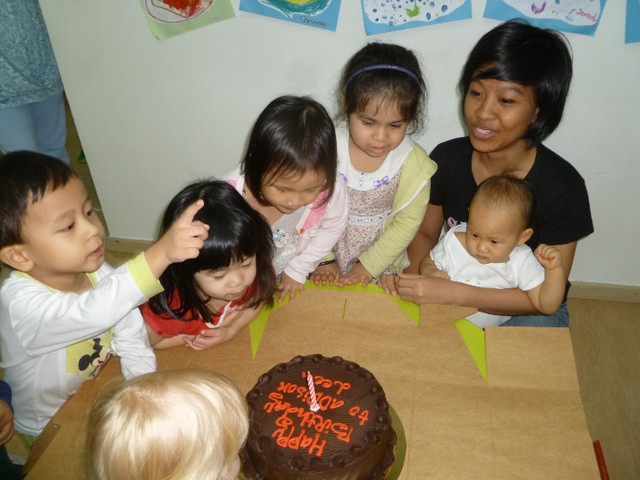 招財滿周歲了!不像他姐姐過三歲生日時,除了準備大蛋糕送到安親班外,還大費周章的準備禮物給安親班的小屁孩一人一份,這次只有大蛋糕一個,不知道外人會不會覺得老二比較不被重視。